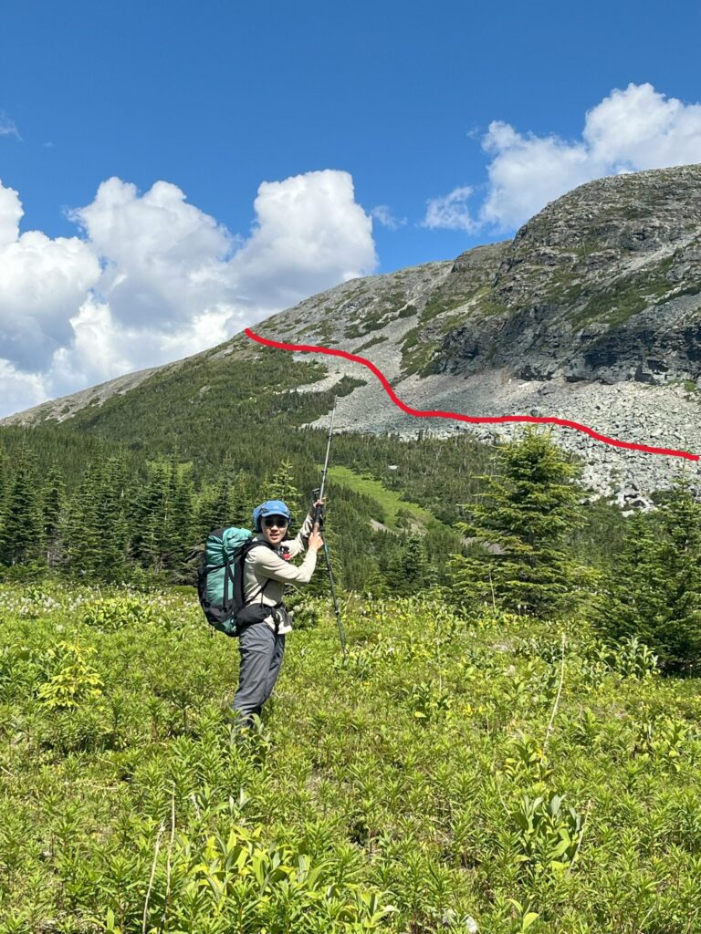 - The sidehilling before camp was steep intense. Shoulder high shrubbery and many gullies. Very slow going.